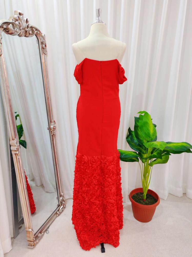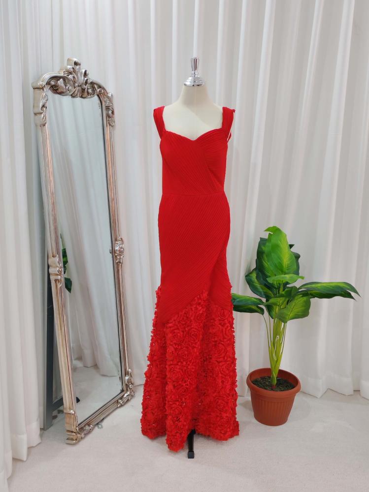 من الخصر وحتى الأرض، ينسدل الفستان بقصة حورية البحر التي تلتف على الجسم وتكشف عن أنوثتكِ بسحر ناعم. ما يُميّزه حقًا هو تطريز الورود البارزة ثلاثية الأبعاد بلون أحمر مشتعل، والتي تمنحه مظهرًا ديناميكيًا وراقٍ للغاية.