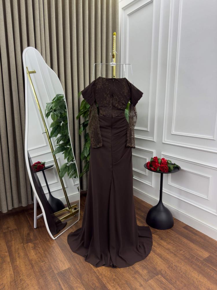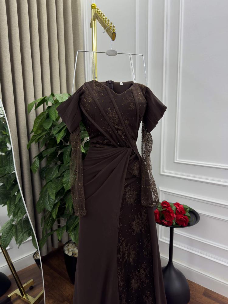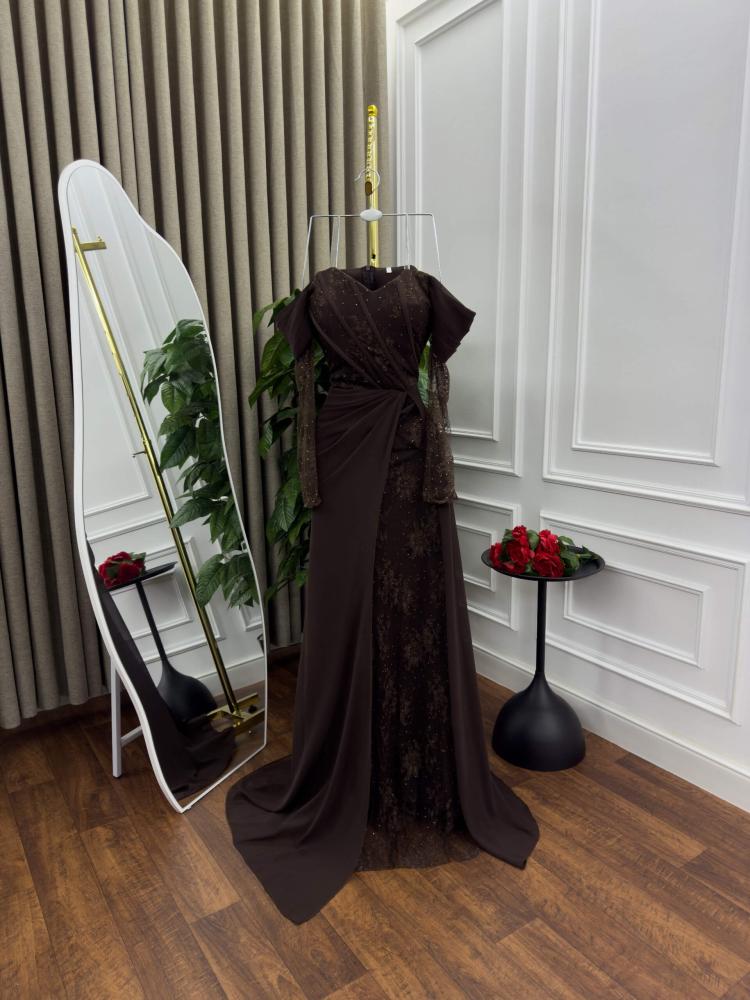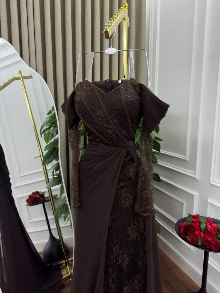 فستان السهرة البني هذا هو تجسيد للفخامة والذوق الراقي. تصميمه المتقن يجمع بين الأناقة الكلاسيكية والتفاصيل العصرية، مما يجعله قطعة مثالية لكل من تبحث عن حضور لافت ولمسة ملكية.