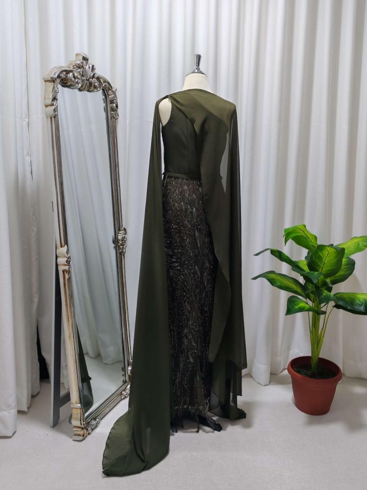 ارتقي بمظهرك مع هذا الـ فستان سهرة الفاخر بلونه الزيتي الملكي وتصميمه الجذاب بكتف واحد، الذي يجمع بين الانفراد والهيبة. الجزء العلوي يتميز بثنيات دقيقة تمنحك مظهرًا نحيفًا وممشوقًا، بينما تنسدل قطعة قماش فخمة من الكتف لتُضفي لمسة ملكية ساحرة.