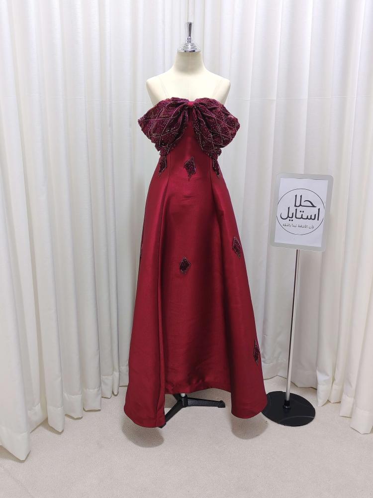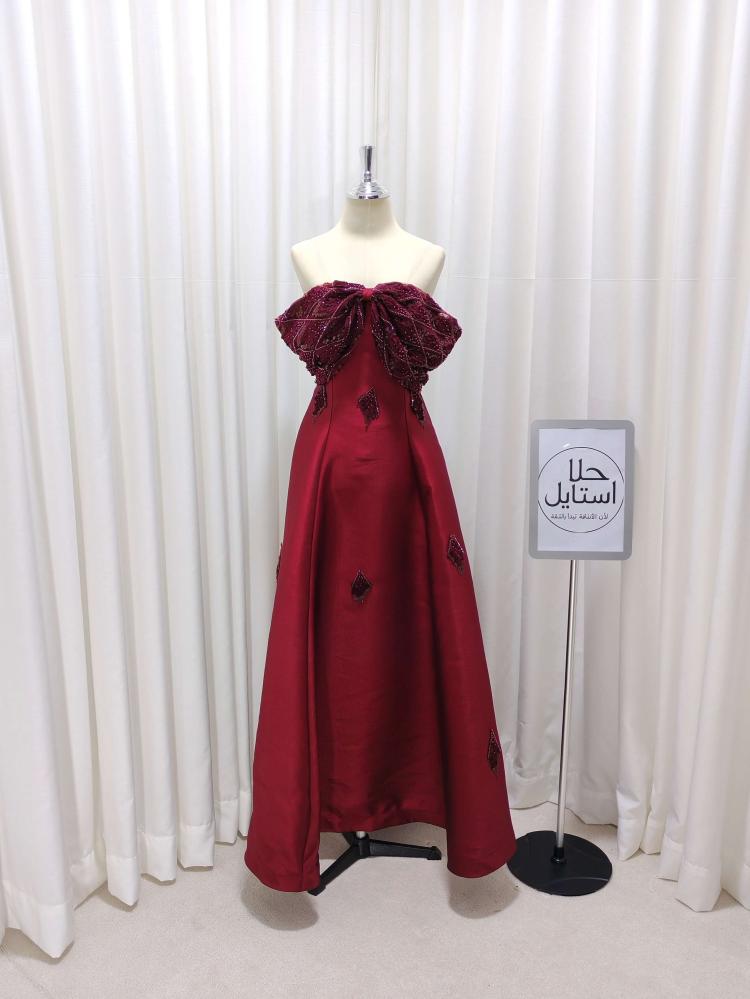 فستان سهرة باللون العنابي الساحر بتصميم عصري يخطف الأنظار من اللحظة الأولى. خامته الفاخرة ولمعته الخفيفة تمنحك حضورًا لا يُنسى، كما أن قصة الصدر الملفتة والمزينة بـ فيونكة بارزة مطرزة بالخرز والترتر تعكس ذوقًا راقيًا وإحساسًا أنثويًا عالي المستوى.
