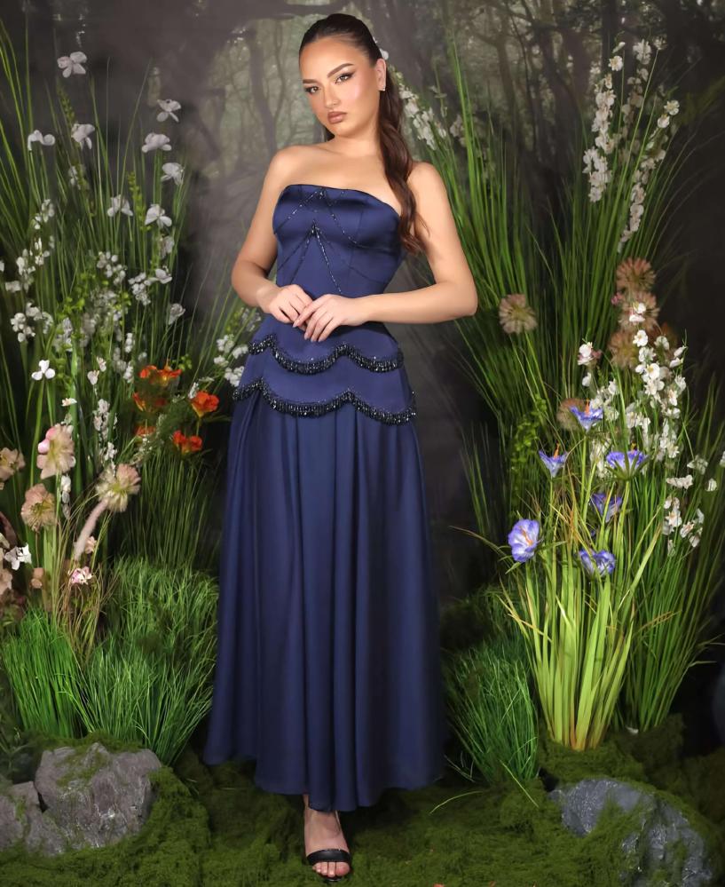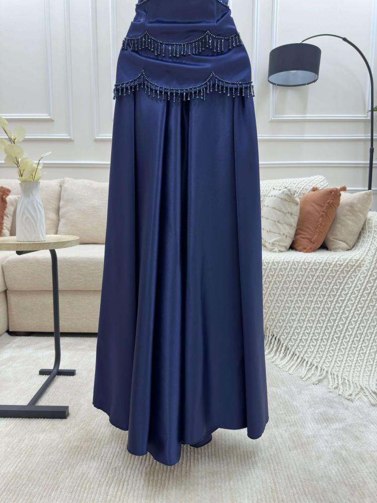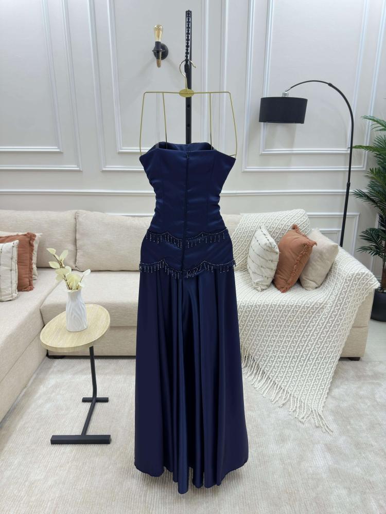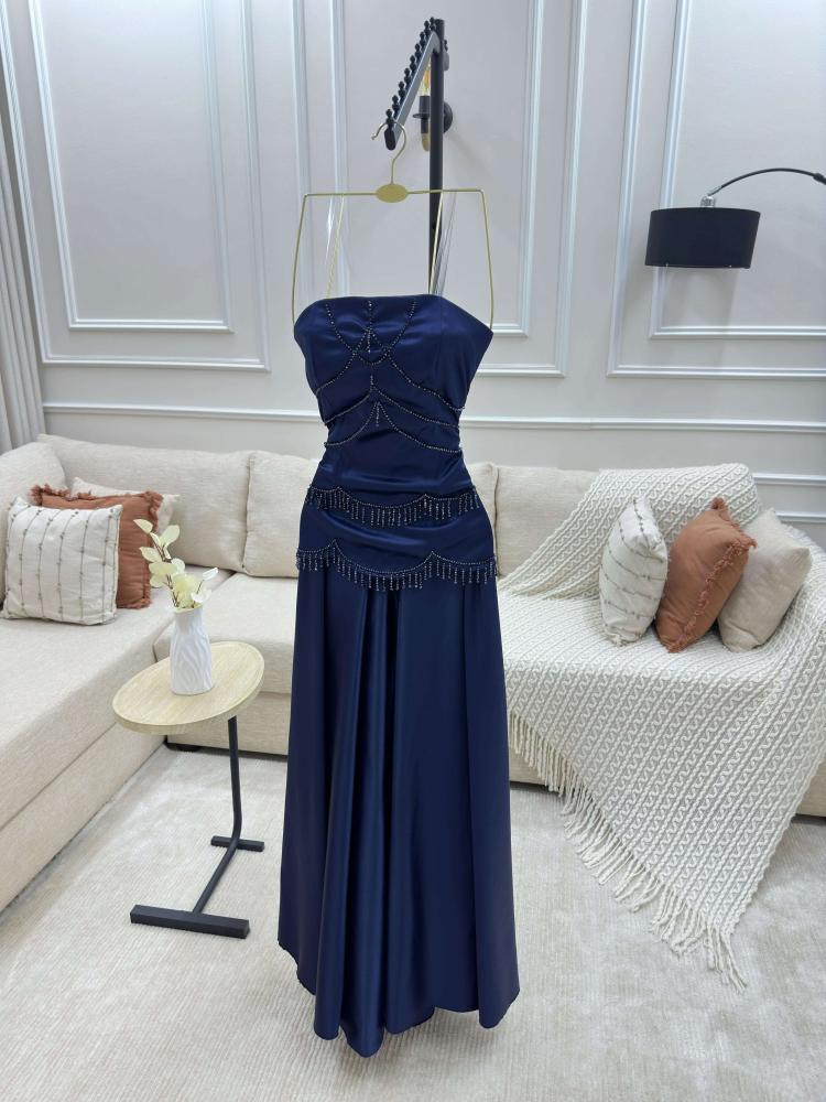 إذا كنتِ تبحثين عن فستان سهرة فاخر يجمع بين الأناقة والرقي، فهذا التصميم المذهل هو الخيار المثالي لكِ. يتميز هذا الفستان الكحلي الطويل بقصة أنثوية جذابة مع كورساج بدون أكمام مزين بتفاصيل من الخرز المتلألئ، مما يمنحكِ لمسة ساحرة تلفت الأنظار.